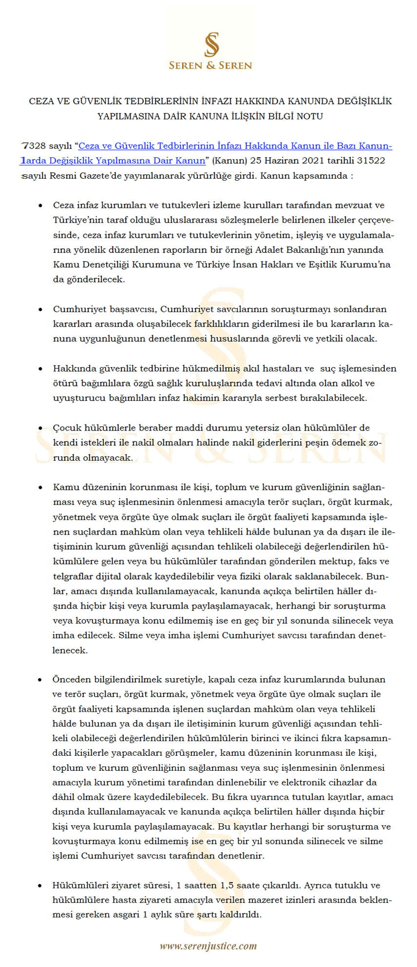 CEZA VE GÜVENLİK TEDBİRLERİNİN İNFAZI HAKKINDA KANUNDA DEĞİŞİKLİK YAPILMASINA DAİR KANUNA İLİŞKİN BİLGİ NOTU
