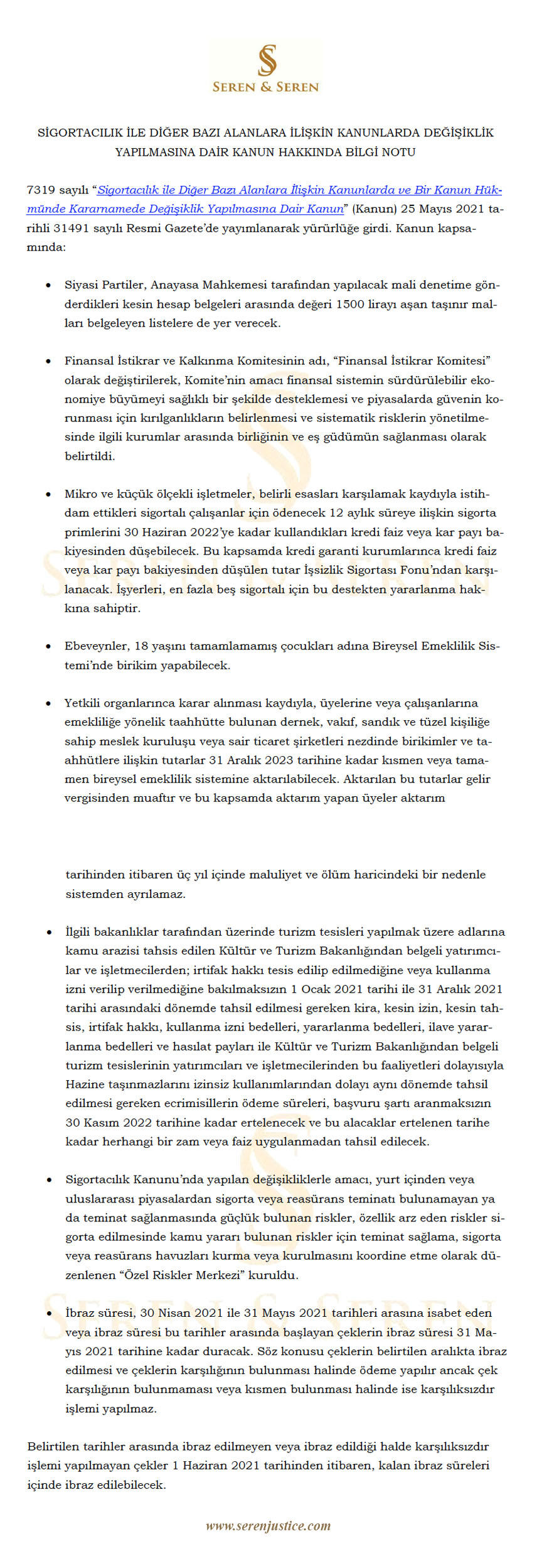 SİGORTACILIK İLE DİĞER BAZI ALANLARA İLİŞKİN KANUNLARDA DEĞİŞİKLİK YAPILMASINA DAİR KANUN HAKKINDA BİLGİ NOTU