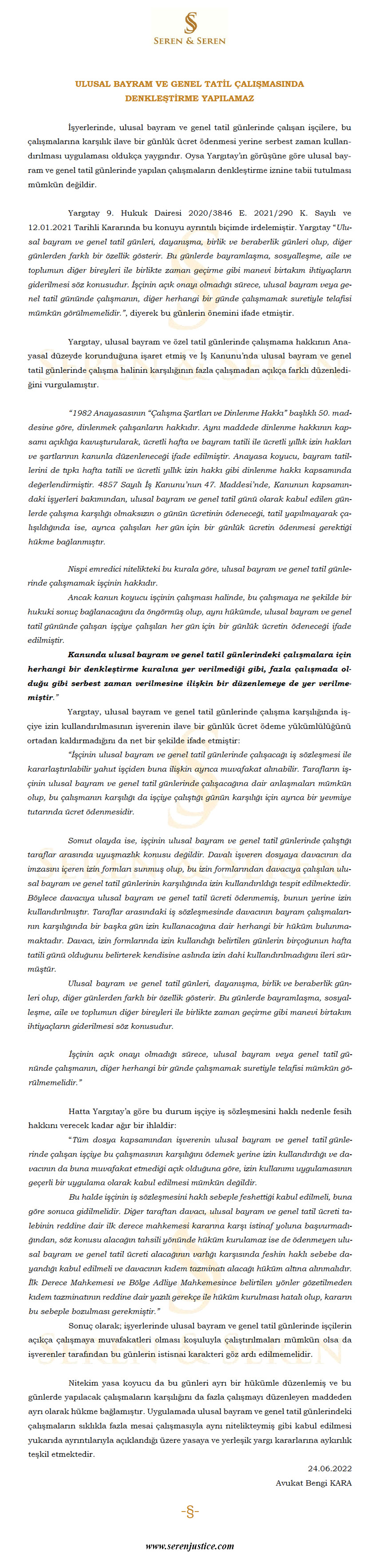 ULUSAL BAYRAM VE GENEL TATİL ÇALIŞMASINDA DENKLEŞTİRME YAPILAMAZ