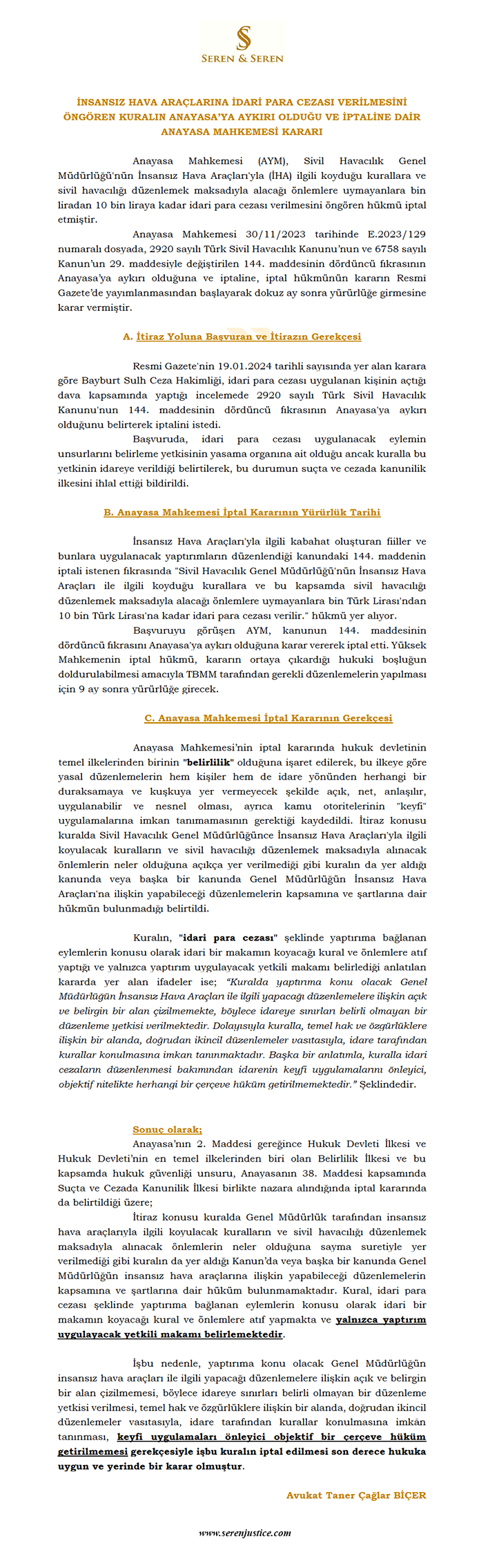İNSANSIZ HAVA ARAÇLARINA İDARİ PARA CEZASI VERİLMESİNİ ÖNGÖREN KURALIN ANAYASA’YA AYKIRI OLDUĞU VE İPTALİNE DAİR ANAYASA MAHKEMESİ KARARI