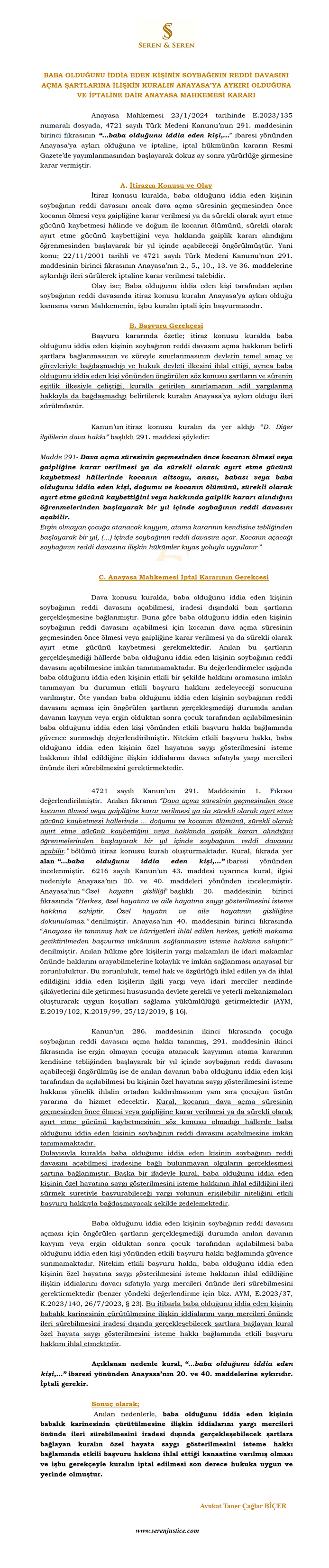 BABA OLDUĞUNU İDDİA EDEN KİŞİNİN SOYBAĞININ REDDİ DAVASINI AÇMA ŞARTLARINA İLİŞKİN KURALIN ANAYASA’YA AYKIRI OLDUĞUNA VE İPTALİNE DAİR ANAYASA MAHKEMESİ KARARI