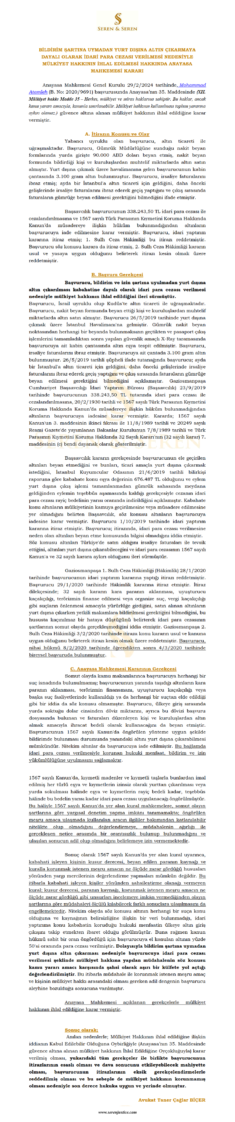 BİLDİRİM ŞARTINA UYMADAN YURT DIŞINA ALTIN ÇIKARMAYA DAYALI OLARAK İDARİ PARA CEZASI VERİLMESİ NEDENİYLE MÜLKİYET HAKKININ İHLAL EDİLMESİ HAKKINDA ANAYASA MAHKEMESİ KARARI