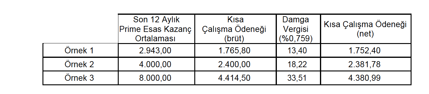 Tabloda da görüldüğü üzere; örnek 1 ve örnek 2’de işçi, son oniki aylık ortalama prime esas kazancının %60’ını kısa çalışma ödeneği olarak alabilmektedir. Ancak, örnek 3’deki ortalama prime esas kazanç, asgari ücretin %150’sinden daha yüksek olduğu için işçi, tavan uygulamasının devreye girmesi nedeniyle, son oniki aylık ortalama prime esas kazancının yüzde altmışına hak kazanamamaktadır. Bu örnekte işçinin alabileceği kısa çalışma ödeneği, asgari ücretin %150’sinin (asgari ücret*2,5) yüzde 60’ı ile sınırlanmaktadır. (2.943*2,5*60/100=4.414,50 TL)